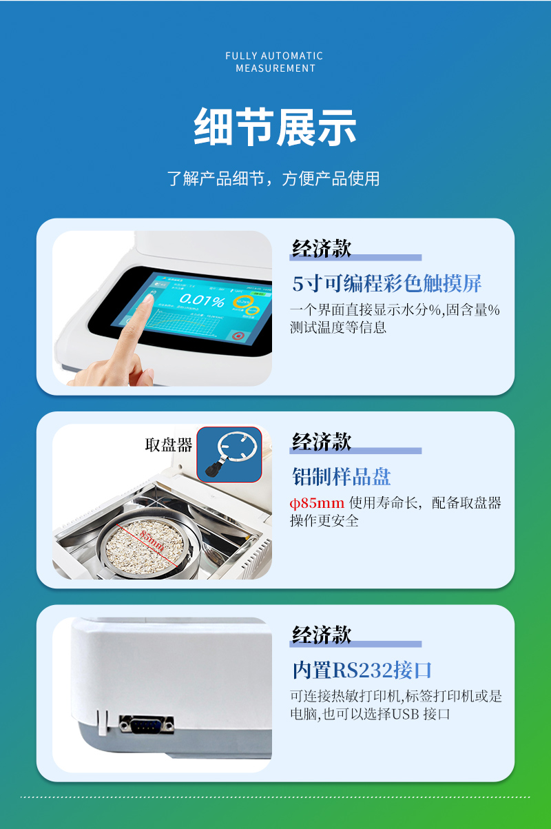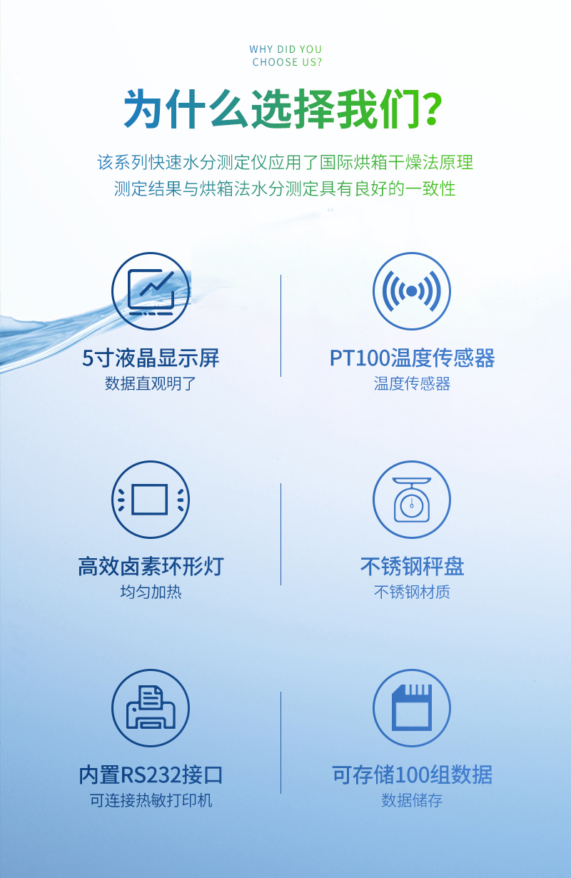 該系列快速水分測定儀應用了國際烘箱干燥法原理,測定結果與烘箱法水分測定具有良好的一致性,工作效率卻遠遠高于烘箱法水分測定,一般樣品只需要幾分鐘即可測量完畢,因此受到廣大用戶的青睞與好評。